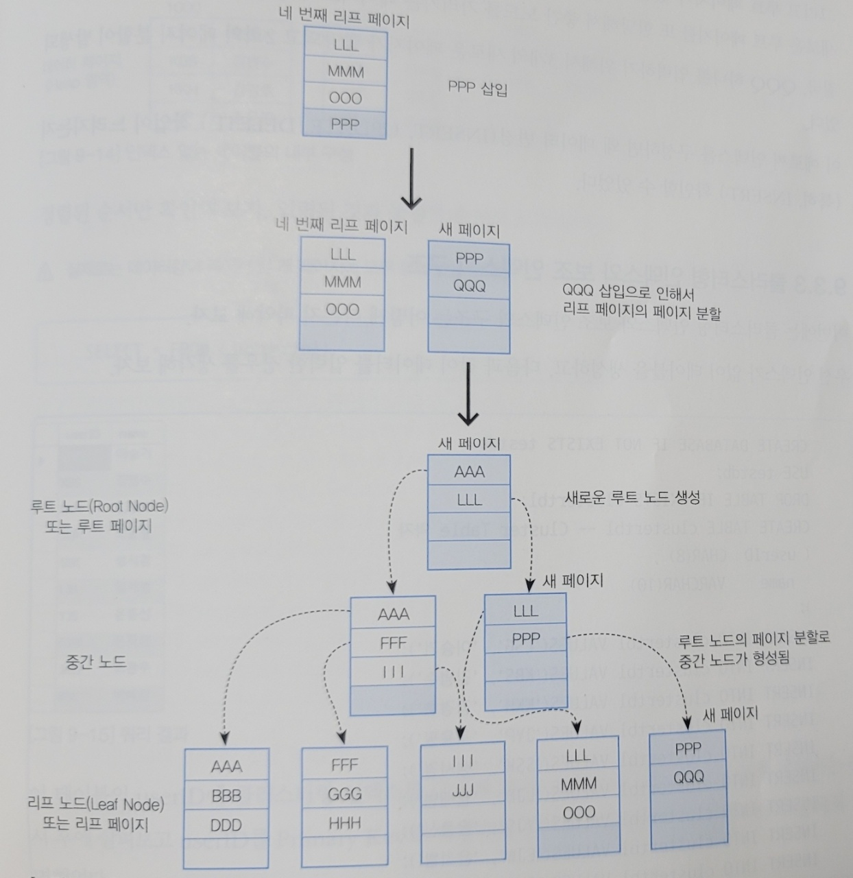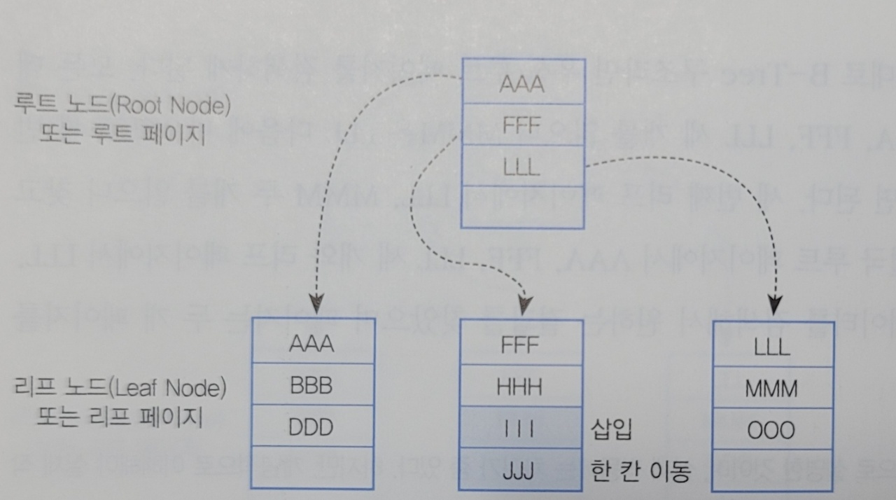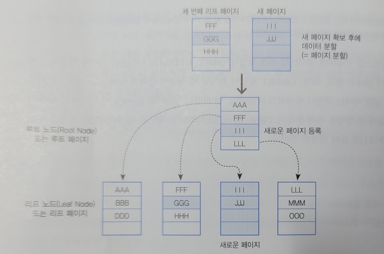 리프노드 공간 부족으로 새 페이지에 데이터 분할.