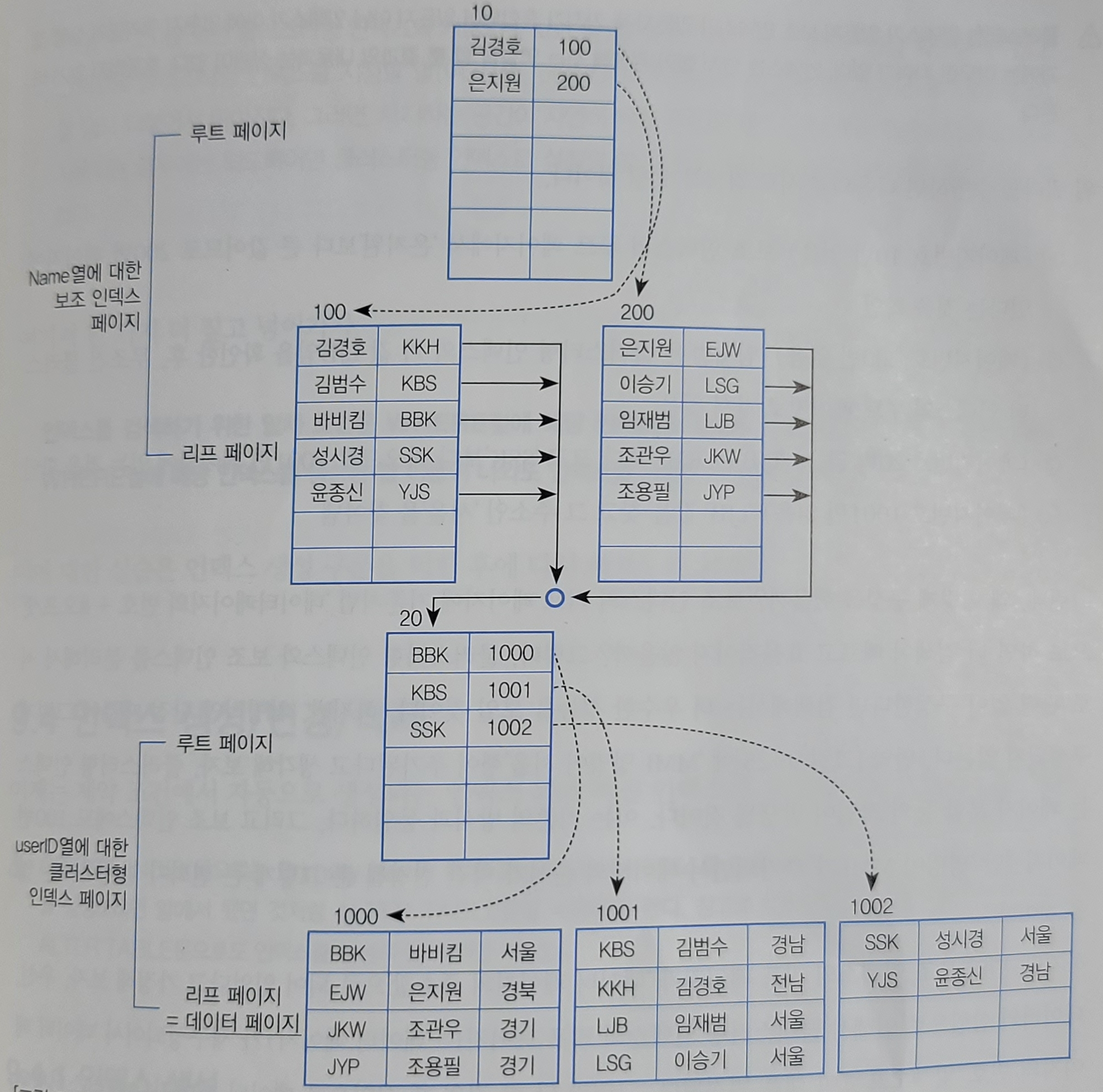 1. (페이지 10 확인) 보조 인덱스 루트페이지 '은지원'보다 큰 값이므로, 200번 페이지 참조