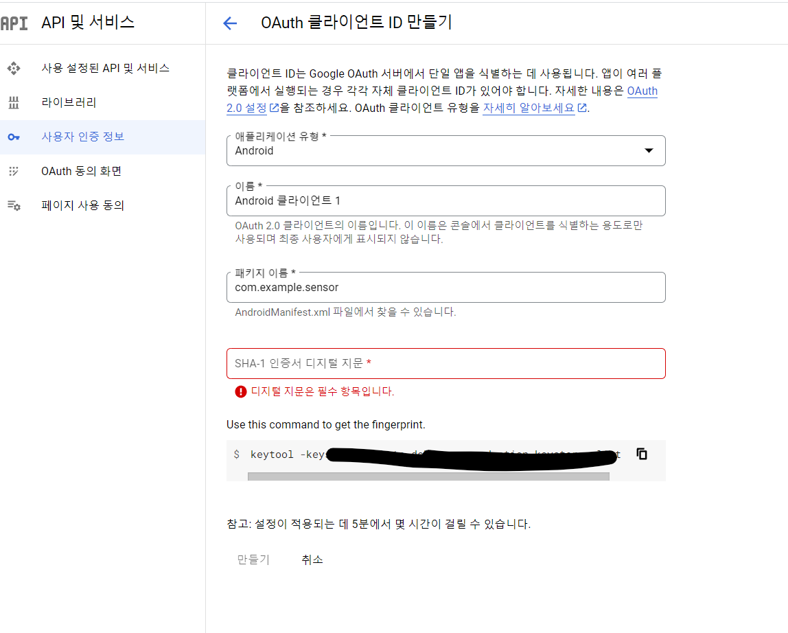 안드로이드 스튜디오 SHA-1 인증서 찾기, OAuth 클라이언트 ID만들기 https://skysoulbear.tistory.com/93 안드로이드 스튜디오 : SHA 인증서 지문 찾기 안드로이드 스튜이오에서 파이어베이스 연동 중 파이어 베이스 프로젝트 만든 후 fingerprint(핑거프린트) 번호라던지 SHA 번호라더던지 뭘 입력하라고 한다. SHA 인증서 번호를 입력 하는 곳은 프로 skysoulbear.tistory.com 도전해보는 자세님 글 나랑 달랐던 점 나는 keytool ~~ 에 대한 명령어가 안됐다. gpt로는 bin폴더에 .jsr? 기억은 잘 안나지만 이런 확장자가 있어야한다고 하는데 난 없었다. 경로를 넣고해도 오류.. 그래서 안드로이드 스튜디오 IDE 터미널에서 gradlew signingReport 이 명령어를 사용했다. 1. java home 환경변수.. 안드로이드 2023.08.17